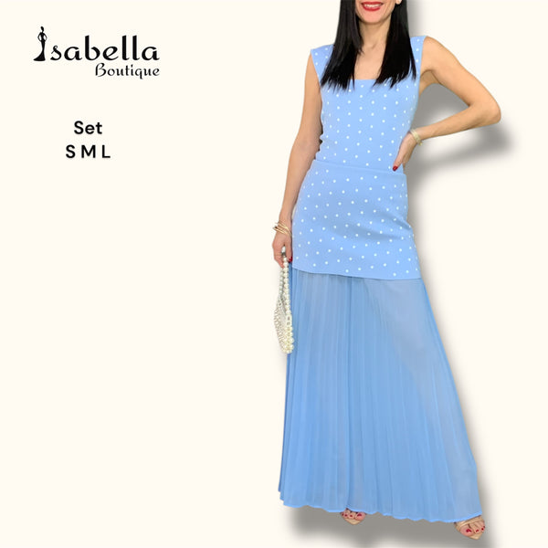 SET DE BLUSA Y FALDA CON TABLONES CELESTE CON PUNTOS BLANCOS