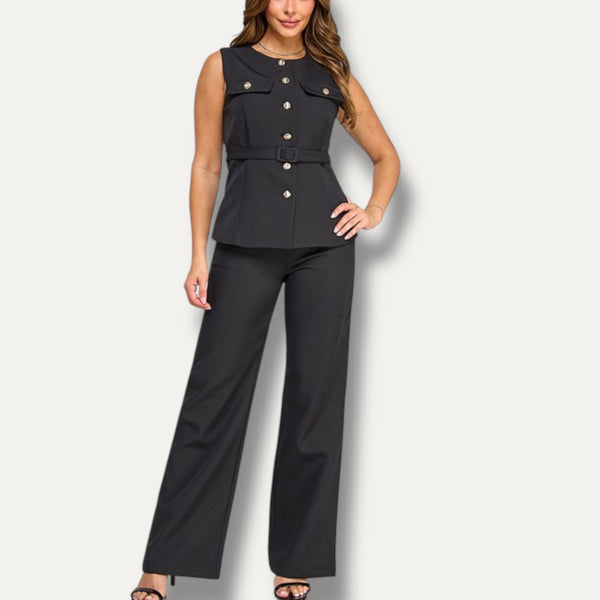 Set negro chaleco con botones dorados y cinto con pantalón en corte recto. Tela suave, no transparenta y no estira.