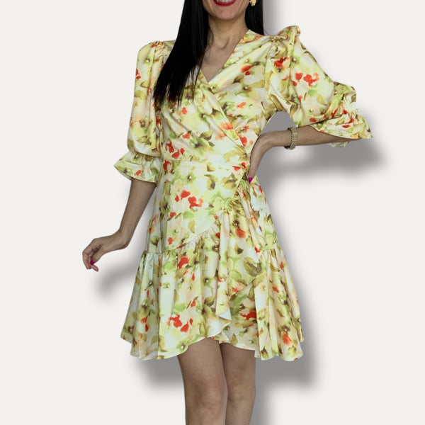 Vestido con estampado en flores envolvente, manga tres cuartos tela tipo satin, no transparenta. Tela no estira.