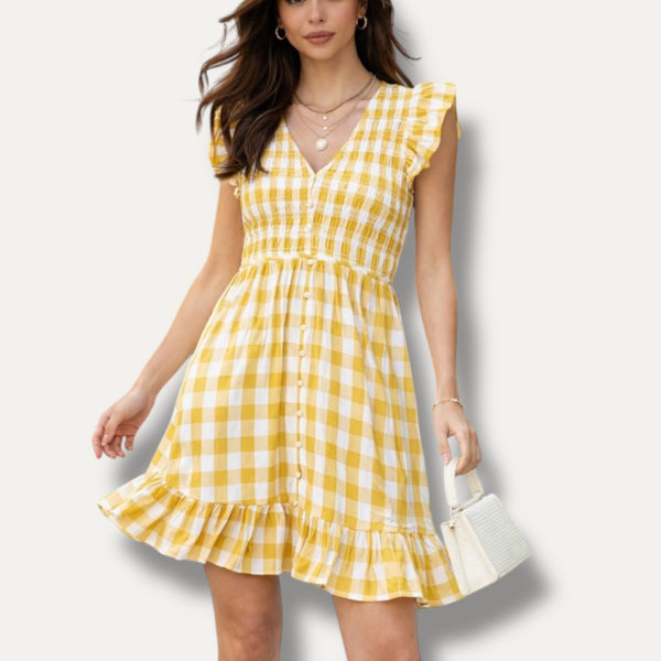 Vestido cuadro vichy blanco con amarillo, elastico en la parte superior tela fresca y no transparente.